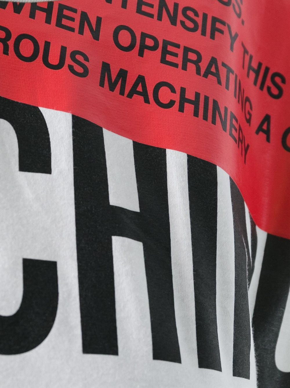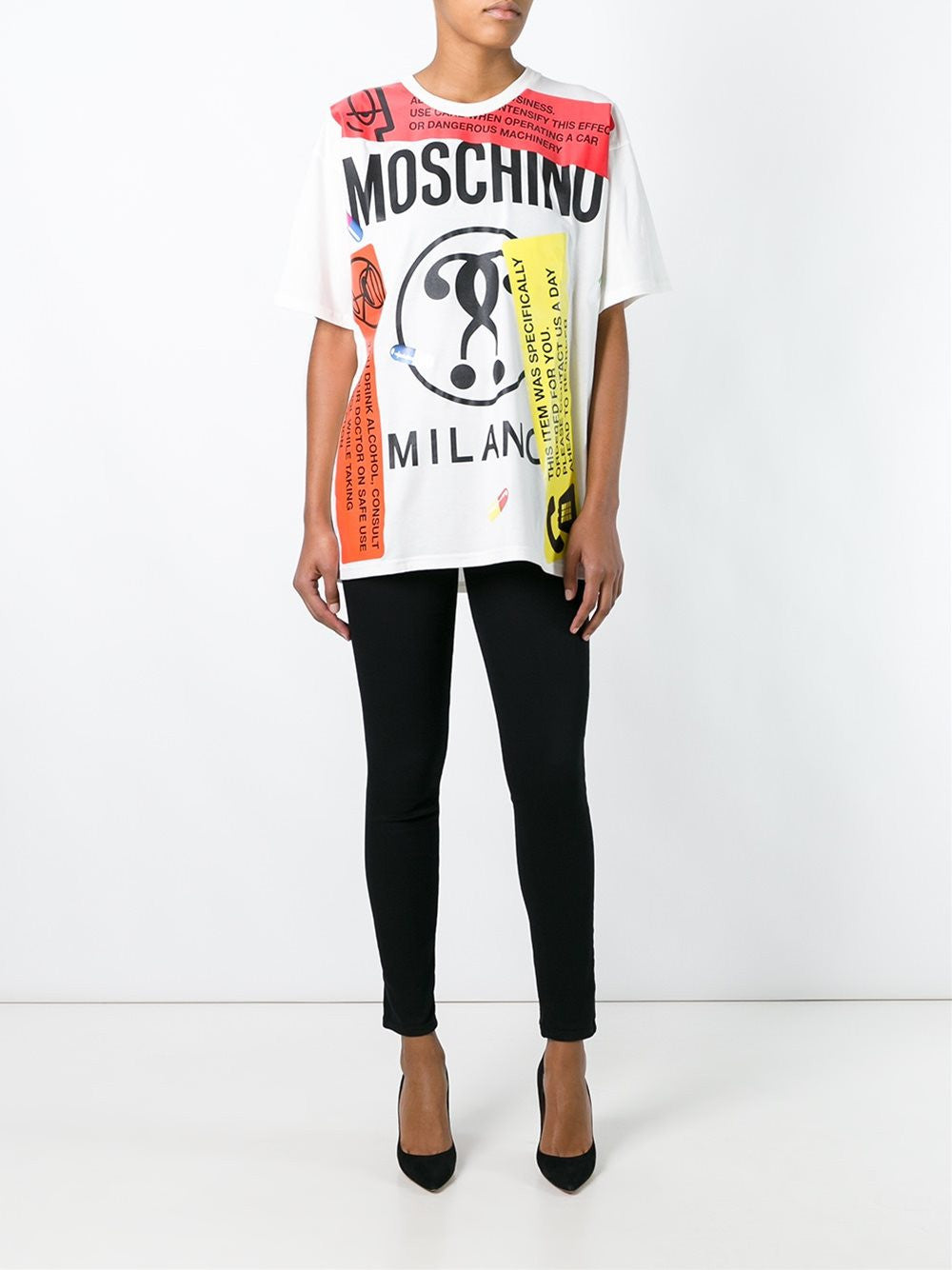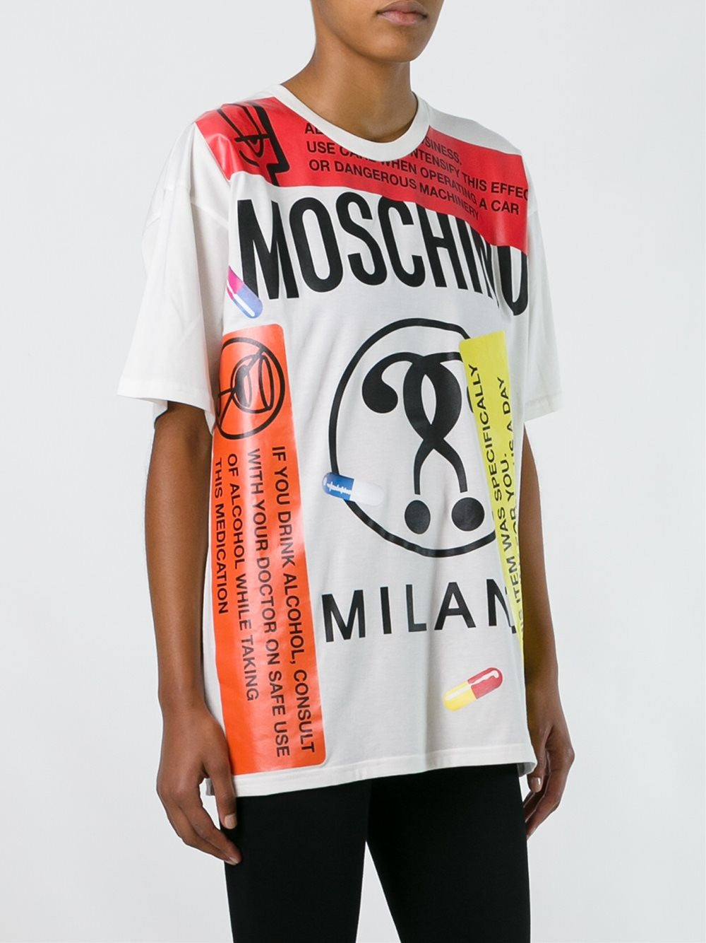 White cotton pill logo T-shirt from Moschino featuring a round neck, short sleeves and an oversized fit. This item is from the Moschino SS17 capsule collection.